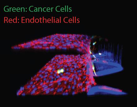 (2)內(nèi)滲:腫瘤細胞通過內(nèi)滲轉(zhuǎn)移進入循環(huán)系統(tǒng)是癌擴散至關(guān)重要的一步。AIM芯片可以在接近于腫瘤微環(huán)境的情況下創(chuàng)建內(nèi)皮單層,然后就此作為癌癥細胞內(nèi)滲的模型。